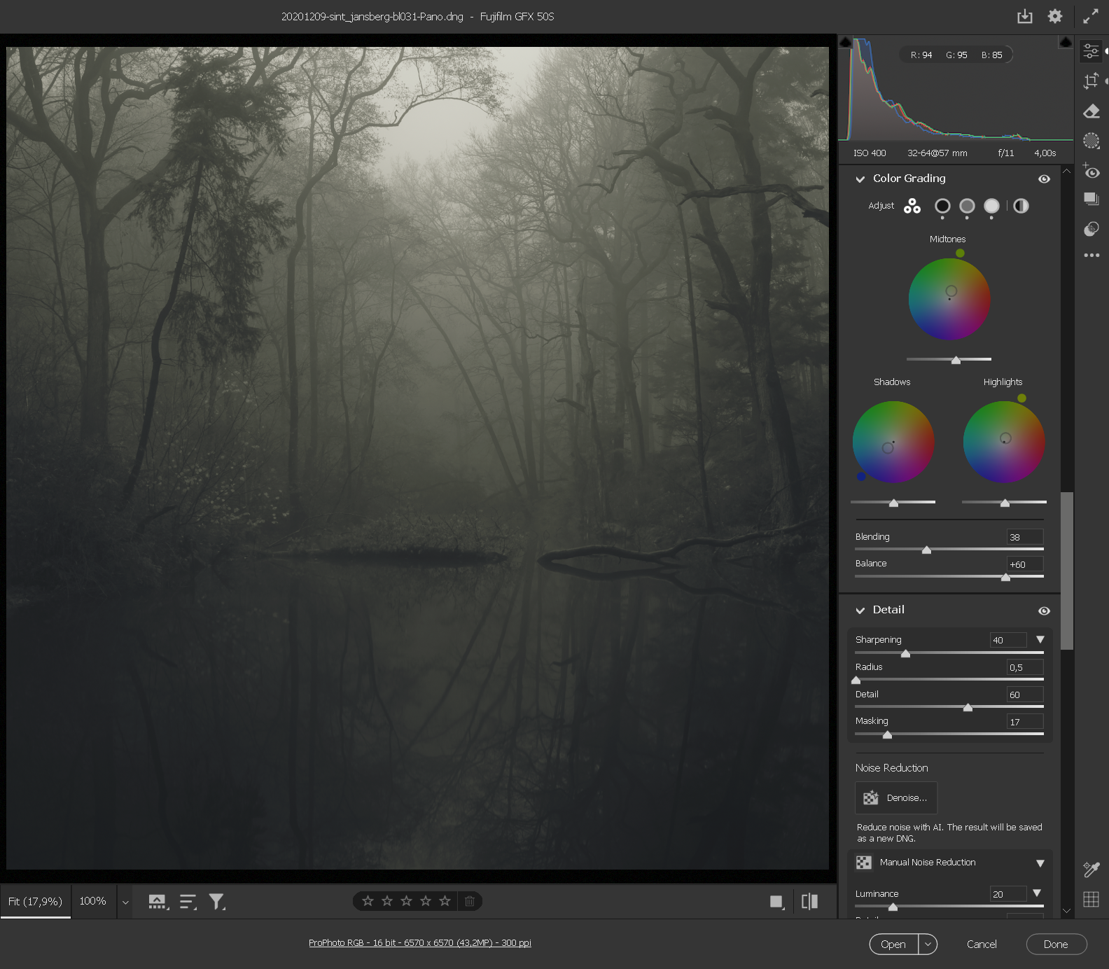 "De foto is blijkbaar met een Fujifilm GFX 50S genomen, waardoor het bijna zonde is als we niet een filmsimulatie profiel nemen als vertrekpunt. Het profiel bepaalt in eerste instantie de interpretatie van licht op de sensor. Zo is het belangrijk dat we niet “Velvia/Vivid” kiezen omdat we daarmee zoveel contrast geven, dat de mist significant minder dicht lijkt. Lijnrecht daartegenover staat ETERNA/Cinema, waardoor dit bijna lineaire profiel de foto toont als een raw-weergave tijdens filmen zonder LUT.