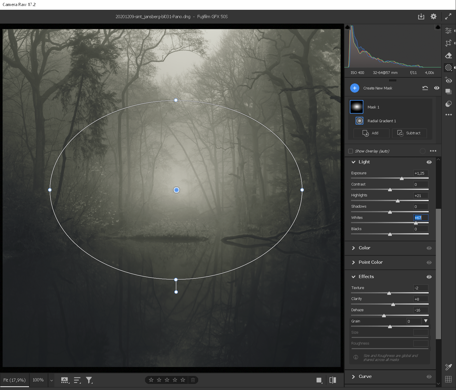 Ik neem een Radial Gradient met maximale Feather en plaats deze over het midden van de foto. Het doel is om het midden op te helderen, zodat het oog trekt naar het eiland en de samenkomende bomen op de achtergrond. Het is een techniek die in series als The X-files werd uitgevoerd door een auto met koplampen aan te parkeren achter de filmset; een budget oplossing voor instant mysterie. Het samenspel van aanpassingen hier zorgt voor het verdichten van de mist en de ruisdrempel laag houden met negatieve Dehaze, terwijl we best wat licht hebben toegevoegd middels de Whites, Exposure en Highlights.