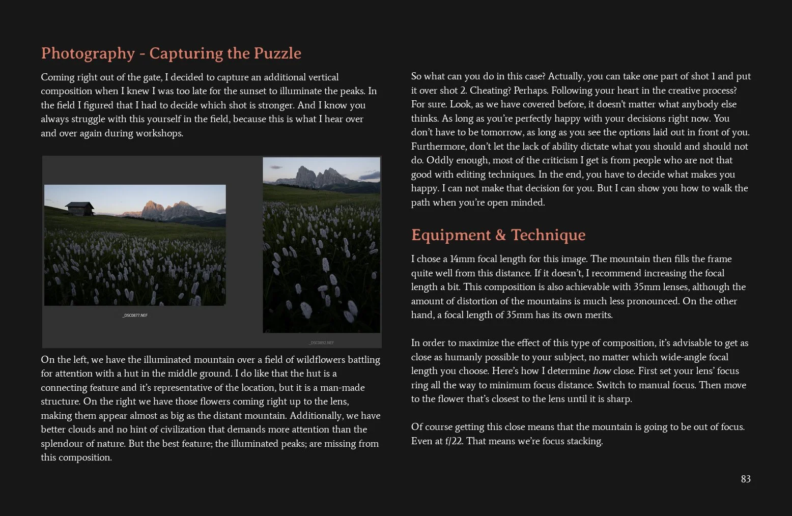 In this 143-page e-book, you will learn everything I teach in the field about mountain landscape photography. From moody telephoto images to getting tack-sharp, sprawling foregrounds to accompany those vast peaks. Come with me on a journey across the Alps, Norwegian mountains, Icelandic Highlands, the Cuillin and the Dolomites as I explain my process in great detail.